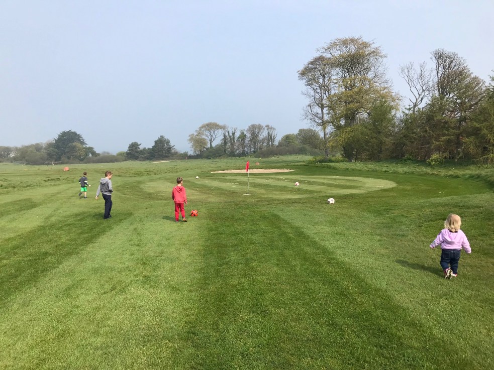 Tactic number 2 was to tire them out. Luckily the weather over the last fortnight has for the large part been exceptional for this time of year, so I was able to bring them to the local park without having to load up on rain gear. The two-on-two football matches are getting more and more competitive and soon the rule where I can only score with my weaker left foot will have to go out the window! Frisbee has also made a welcome entry into our outdoor games repertoire and with a bit of work the boys were soon making regulation 10 foot passes to each other albeit there was still the occasional moment when fear of frisbee finger (the smacking of a knuckle with hard plastic) would cause an elementary drop. Interestingly, while we were playing our games, an outdoor boot-camp was taking place within earshot. At one point Oscar (age 6) edged towards me and whispered in a secretive tone “that lady said a bad word”, I glanced over as she did another 10 burpees and gave her an understanding nod. The trip to the park was an unqualified success, so much so that I decided to take it up a level and try out something completely new, footgolf. For those of you not aware of footgolf, it is as the name suggests a cross between football and golf. It basically involves trying to kick a ball into a hole in as few attempts as possible. Following a bit of online research I decided to bring the gang to Deer Park in Howth which has an 18 hole footgolf course. Deer Park has many fond memories for me as it was the place where I learnt to play full blown golf, having honed my short game on the pitch and putt course at St Anne’s. Back in those days, a round of golf involved a dart trip to Howth station and then carrying my bag of overly heavy clubs up the exceptionally steep hill to the Deer Park ticket office. Getting to the first tee was already an achievement worthy of an army cadet, so no wonder my first tee shot back in the day ended up skewing off the toe of my wooden driver (remember those) and scattering bodies on the nearby putting green. Back to the present and the 9 hole golf course in Deer Park has been converted into 18 holes of very enjoyable footgolf. Well mainly enjoyable, though there were three negatives to the experience. First of all our footwear (runners / trainers) was nowhere near sufficiently water-proof to deal with the moisture on the course (particularly in the rough). Secondly Ella (age 2) got pretty fed up after about 9 holes when we had reached the lowest part of the course and had to be carried around the back 9 (coincidentally she’s probably a similar weight to my old golf clubs). And last but not least I managed to pull my quad muscle on the 14th hole trying to knock it onto the green of a par 4 in one!! I had been playing pretty well up until that point and may have even gone up in my kids estimations with a display of strength and accuracy from my trusty right foot. There was even talk that I could have been a professional footgolfer at one point before the high-pitched scream of anguish on the 14th hold brought me back down to earth!